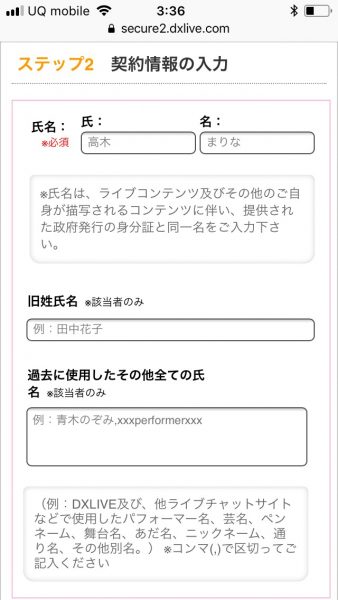 次に2ステップとして、「契約情報の入力」を行います。氏名には身分証と同じものを入力します。